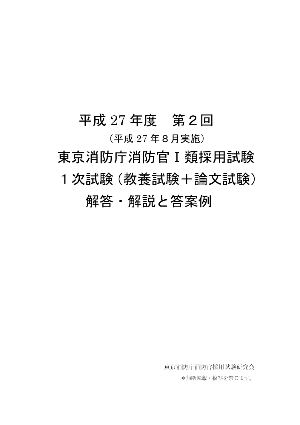 東京消防庁消防官Ⅰ類採用試験・平成27年度2回目(8月実施)の1次試験の解説資料です。教養試験では問題ごとの詳しい解答・解説の他に、出題分野別の傾向と対策などもまとめています。論文試験については出題されたテーマをていねいに整理・解説したうえで答案例を掲載。本編の解説冊子の他に、東京の防災対策など、チェックしておきたい主要論点をまとめた「論文対策資料」(最新2016年1月版)も別ファイルにしてつけています。